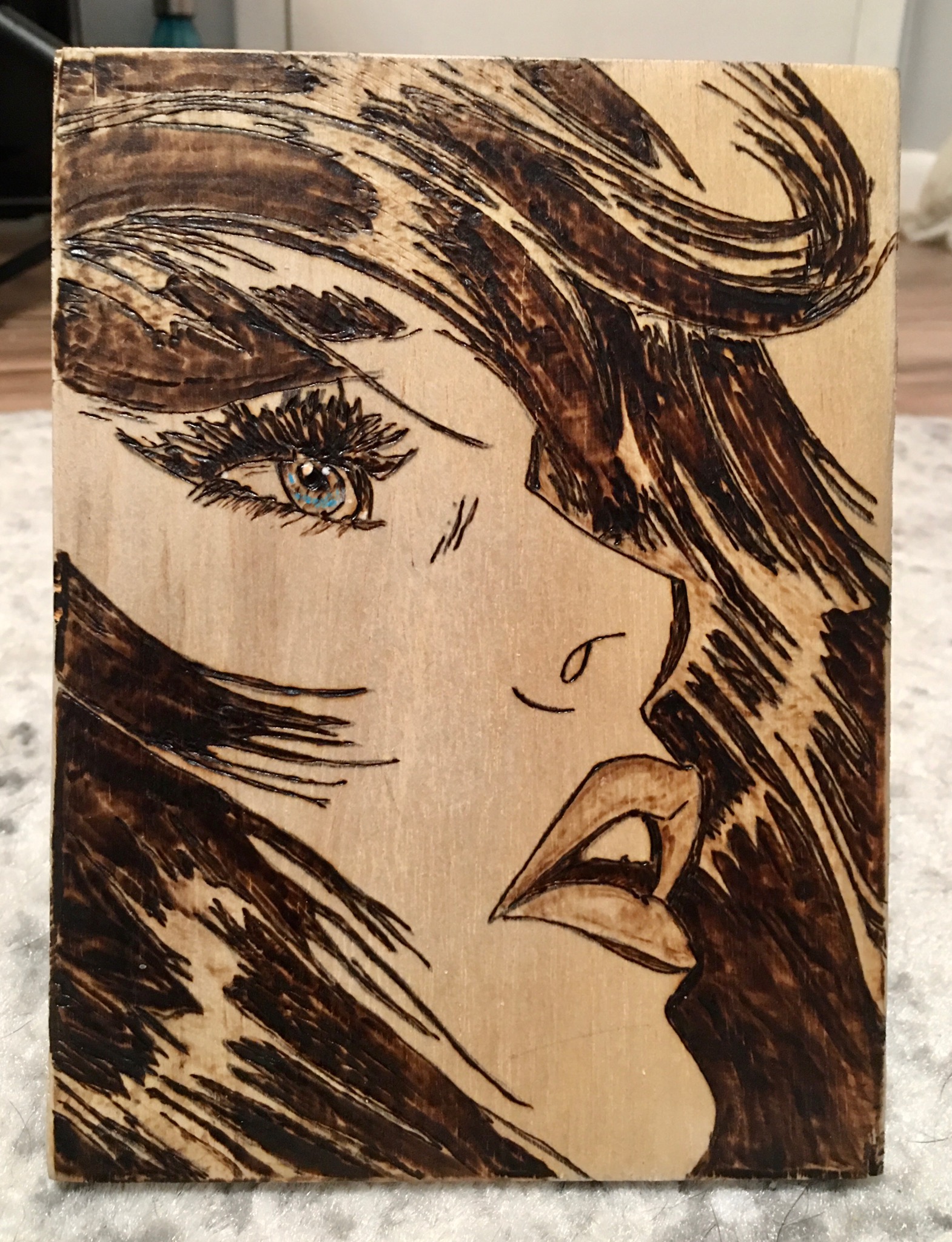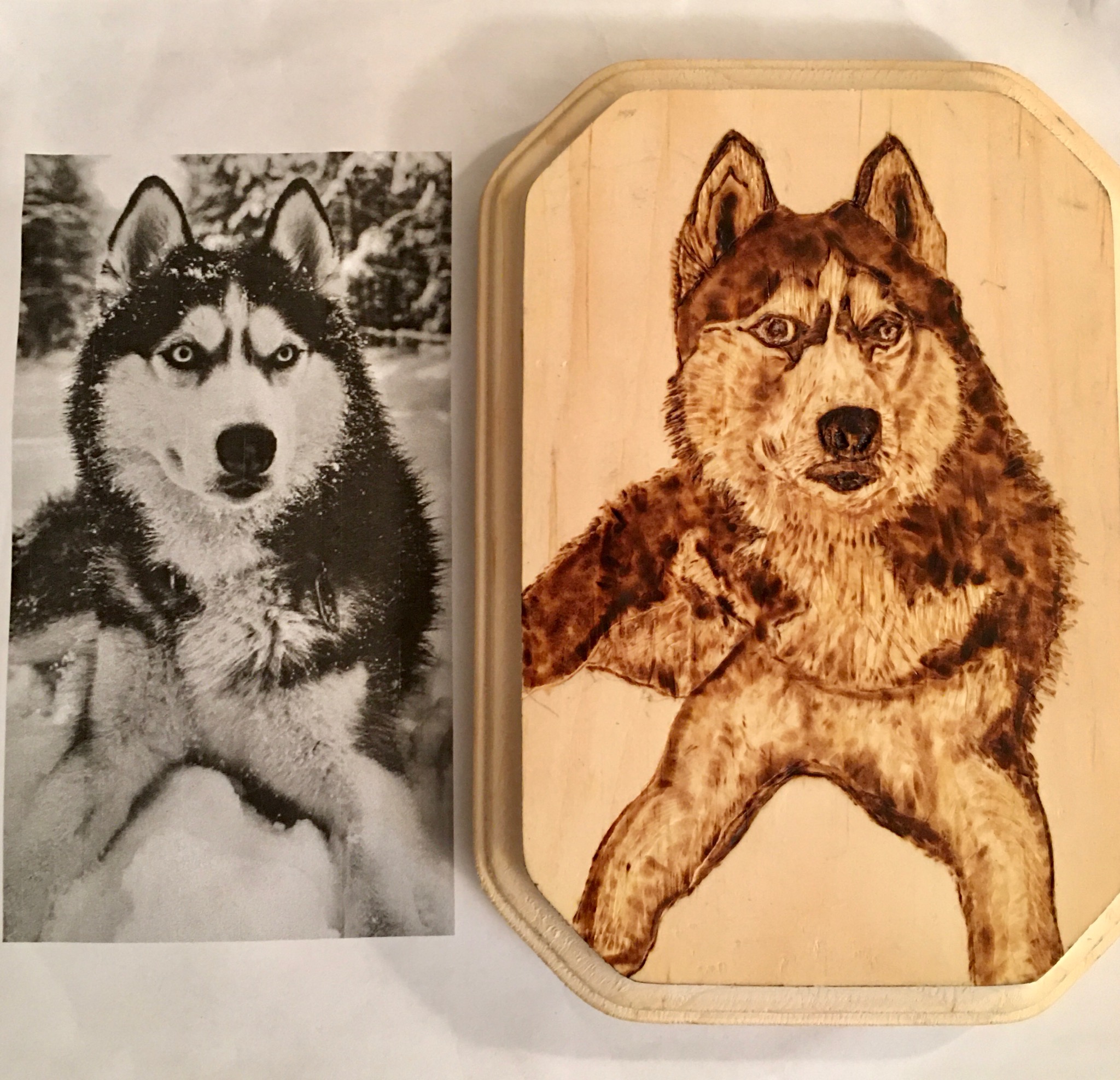 Custom Woodburning of a Pet Portrait by local artist Dale Werner Now Available!